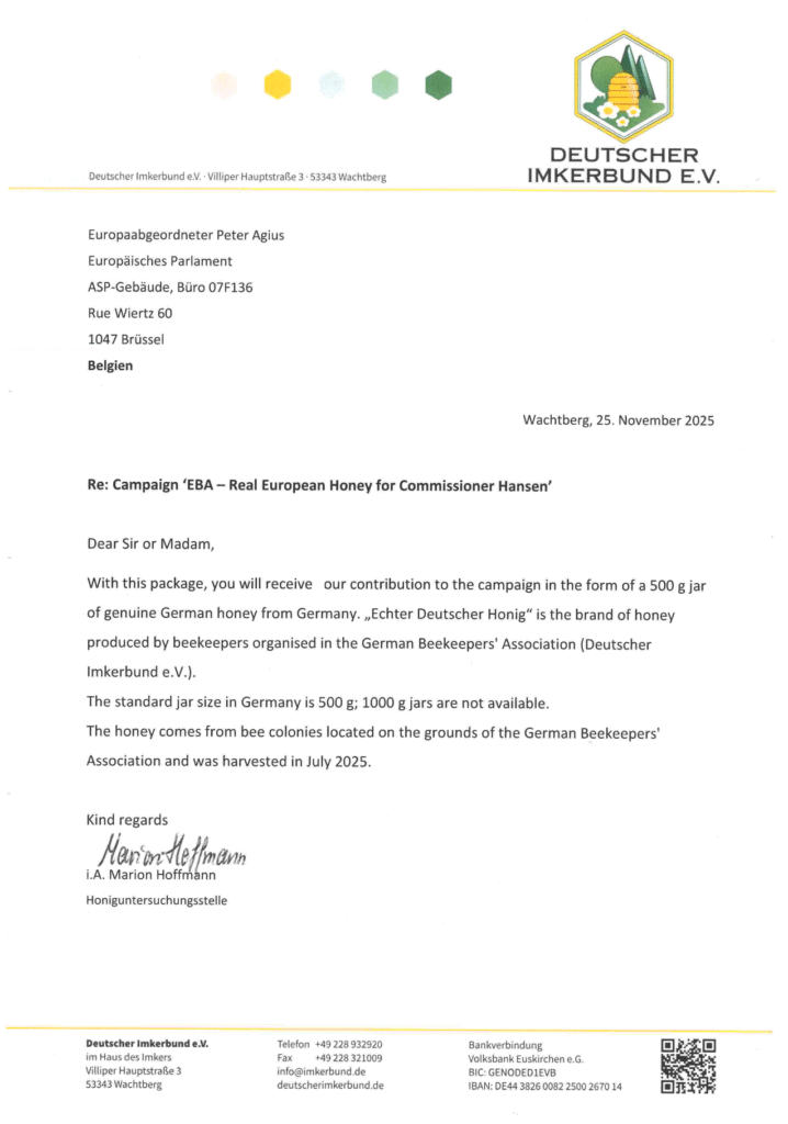 There is a copy of our letter regarding the honey sent from Germany and a photograph of the honey jar.